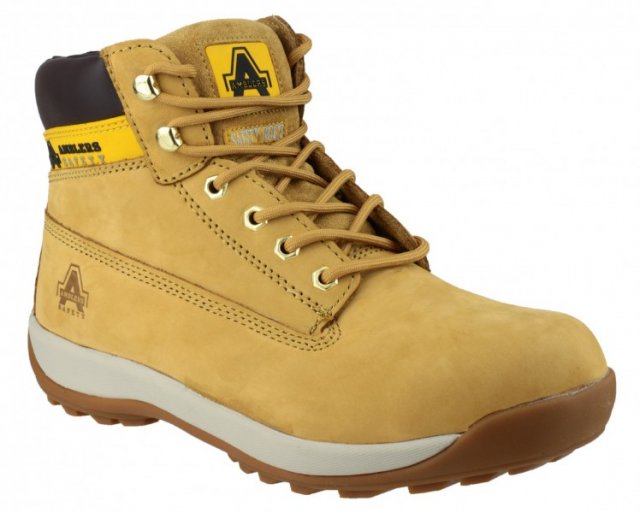 Classic honey safety boot in a unisex size range suitable for the workforce. Toe protection tested to 200 joules impact. Steel midsole protection to 1100 Newtons. Crafted with a hardwearing Nubuck leather upper. Lace-up front with four eyelets and upper speed lacing hooks. Full cushioned padded PU collar. Padded suede tongue. Cushioning MD/Rubber sole. Passes SRA slip resistant standards.