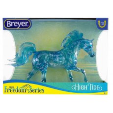 The ocean calls and High Tide answers! Inspired by the untamed beauty of the sea, this stallion’s wild mane and tail take on the color and shape of cresting waves that are preparing to crash over cerulean waters. High Tide’s coat color mimics the layered blue and silver hues of the ocean, and is finished with a gorgeous high gloss finish. Window Box Size: 11"L x 2.65"W x 8"H