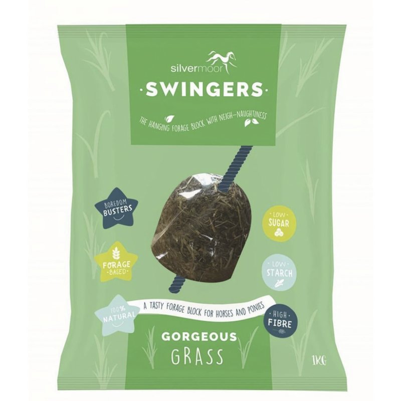 Silvermoor Swingers is the only hanging forage block made from 100% natural ingredients with no added sugar., The unique swinging design means the horse has to work to be able to eat it. This means it cannot be eaten quickly and will take longer to eat than similarly sized traditional blocks of forage. Eating regularly promotes saliva production which buffers stomach acids and helps prevent against gastric ulcers., Silvermoor Swingers are low in sugar and low in starch. They provide a healthy addition to be used to compliment the horses’ diet and can help manage weight. They are safe to use for laminitics and good doers as well as insulin resistant horses and those suffering from EMS.Delivery Information